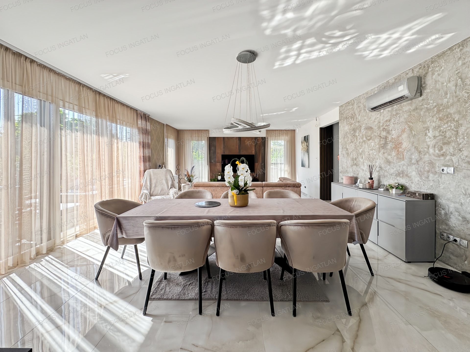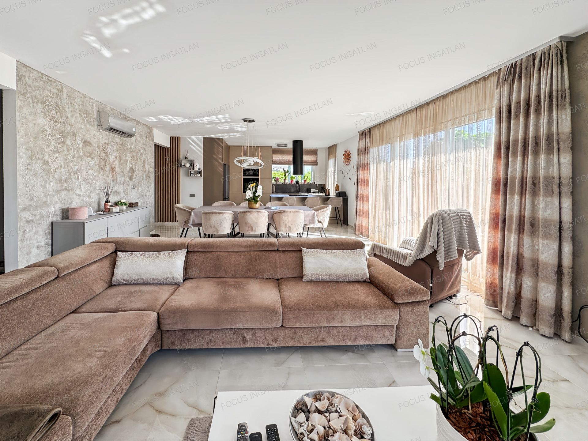A házban a napfényes, amerikai konyhás nappali adja a közösségi élet központját. A nagyméretű ablakok nemcsak világossá teszik az otthont, de mindegyikhez elektromos redőny is tartozik, ami extra kényelmet és biztonságot nyújt. A kellemes hőmérsékletről nyáron a beépített klímák gondoskodnak.